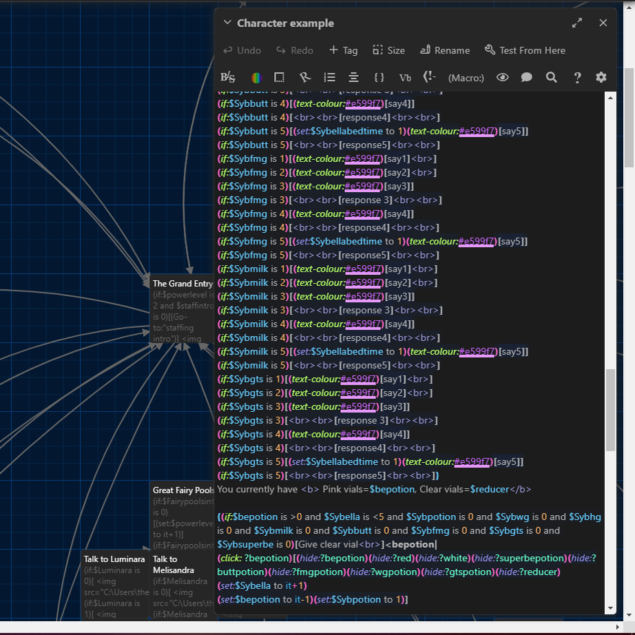 I've attached a screencap of one of my passages in Twine as an example of simple programming. It is a blank template I made to quickly copy/paste a character interaction main page. The entire thing would be just over 8 pages.