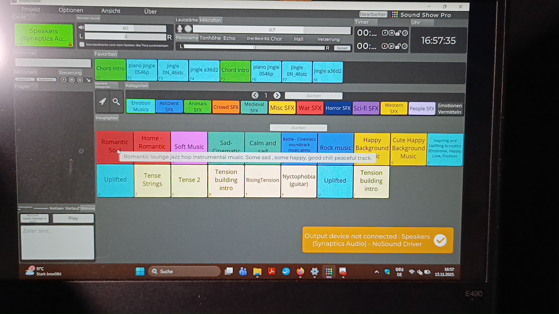 I wanted to connect my computer to a sound system of a theatre I am engaged in. Tried cable and blue tooth, installed the most recent drivers, however nothing seem to work. Now the settings are so bad that I cannot even use the app on my computer. When I press a sound button the error message occurs : "Output device not connected (Synaptics Audio) no sound driver"