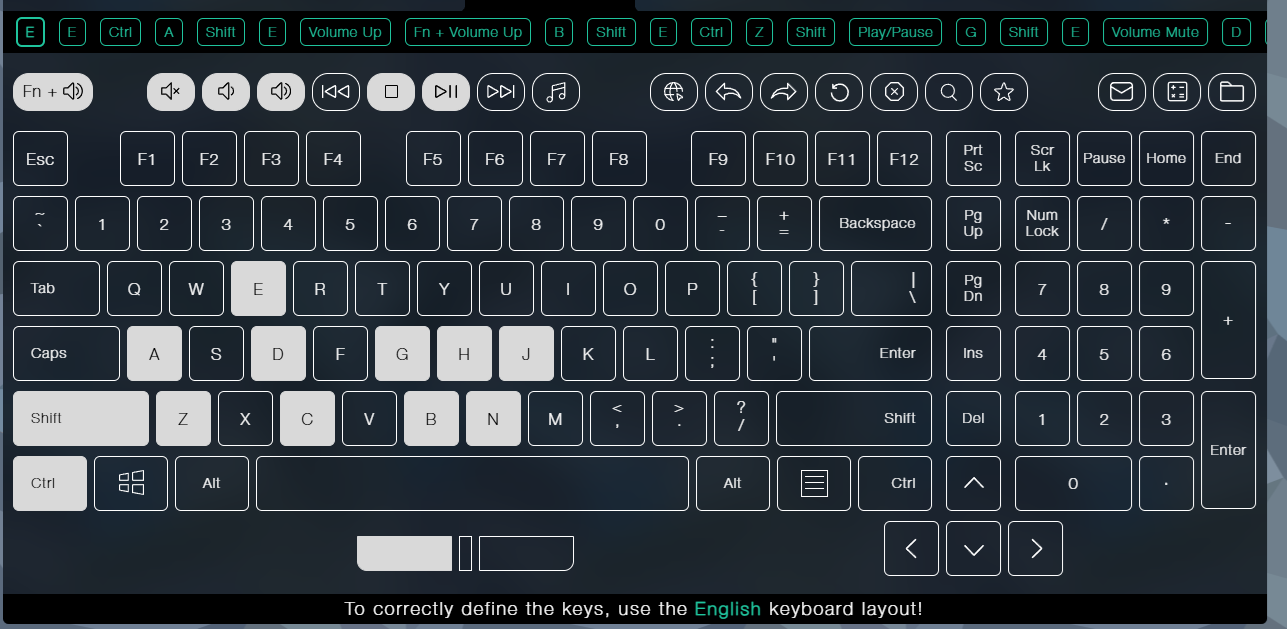 I've looked into this a bit more. The only function key I'm touching is F11 for the global stop. I'm guessing that your keyboard/driver, or maybe your OS, uses some of these [ctrl + letter] combinations as shortcuts for volume/play functions. If you want to test this theory, on your desktop with everything minimized, hold down ctrl and then all those letter keys in sequence and see if they do anything?