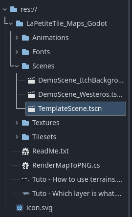If you want to create your own scene (not duplicating TemplateScene.tscn), you have to create several TileMapLayer nodes (as it is in the TemplateScene and DemoScenes) and add the given Tile Set files to each, they are already included in the /Tilesets/ folder.