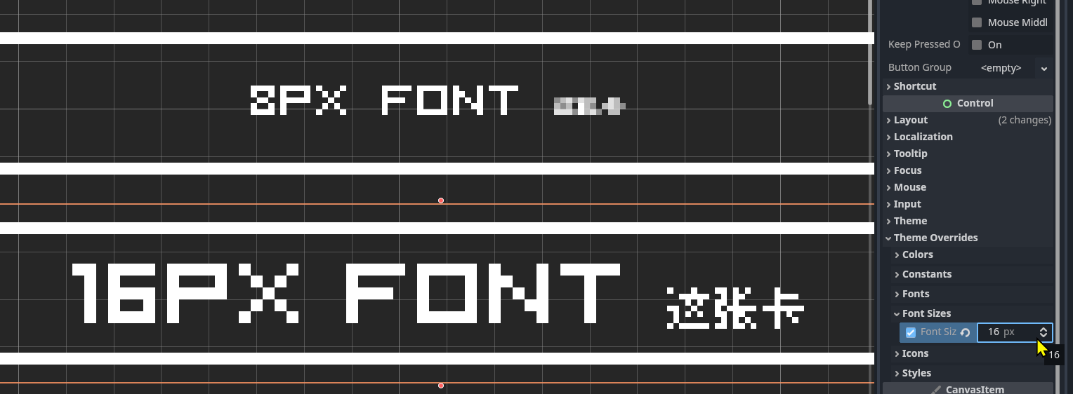 That's not my font in your screenshot... But you're right. Also, the text seems to be drawn 6px below what's expected...I'm gonna take a look on this issue soon for an update, It may take a few weeks.. For now, you can set it at 16px in Godot, your text will still displays cleanly at 8px tall.