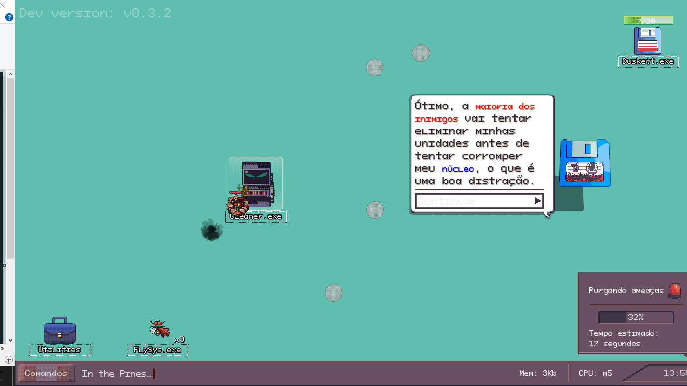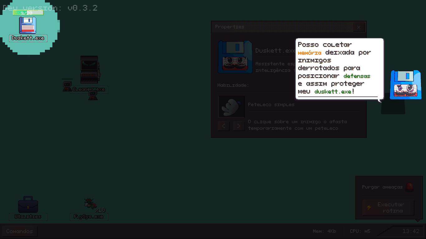 - Depois que morri uma vez, fui na pressa clicar com o botão direito pra colocar um Cleaner logo na primeira rotina (esqueci que precisa de memória lol), mas depois do diálogo "Que desastre! Não tenho memória suficiente para colocar defensas." o mouse fica impossibilitado de coletar memória. Pensei que tinha dado softlock, mas cliquei em Executar rotina e voltou ao normal.
