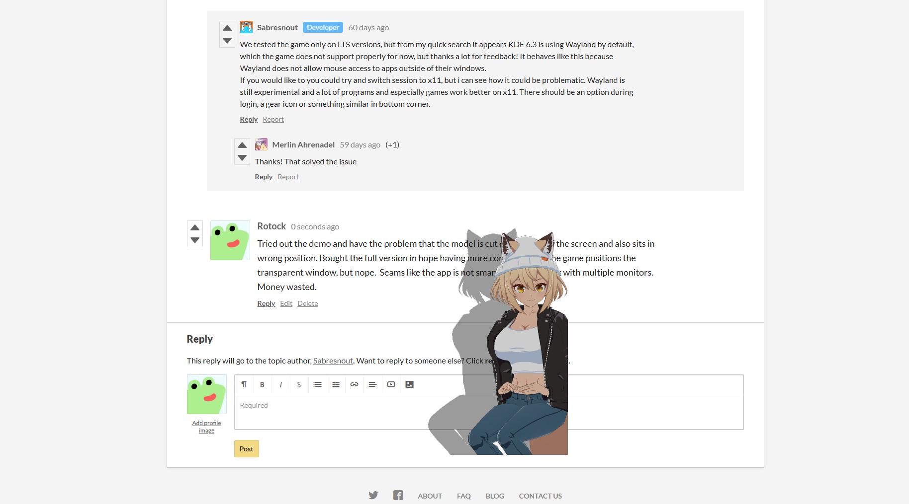 Tried out the demo and have the problem that the model is cut of in middle of the screen and also sits in wrong position. Bought the full version in hope having more control of how the game positions the transparent window, but nope. Seams like the app is not smart enough to work with multiple monitors. Money wasted.