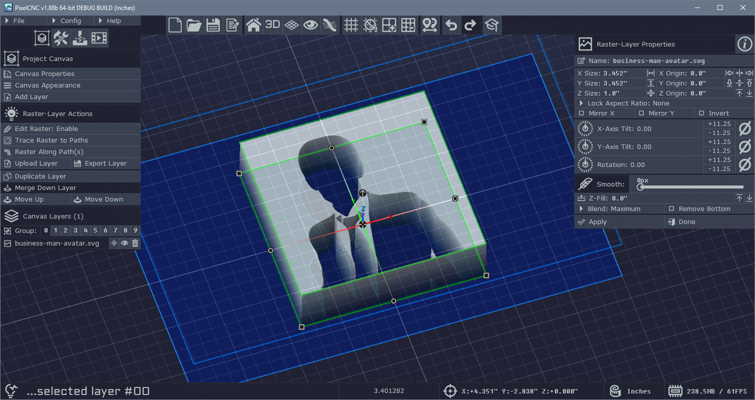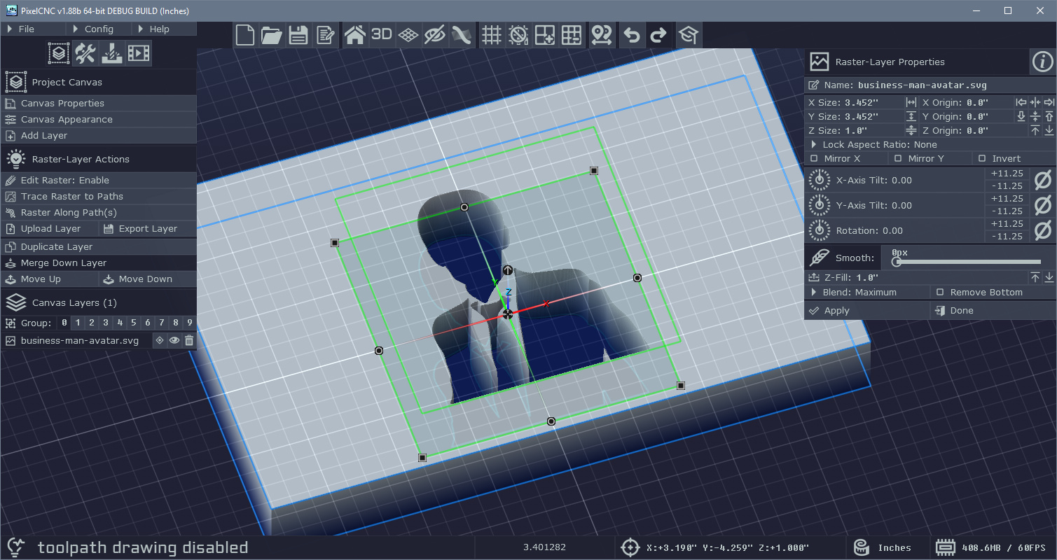 Here's a simple example where I've loaded an SVG as a raster-layer and then scaled it down before generating a toolpath. By raising the layer's Z-fill to the top of the canvas we prevent a contour from being generated around the edges of the raster-layer: