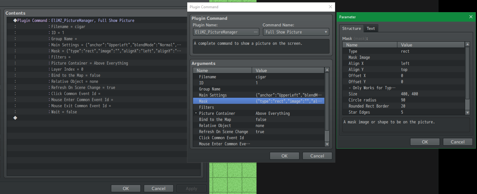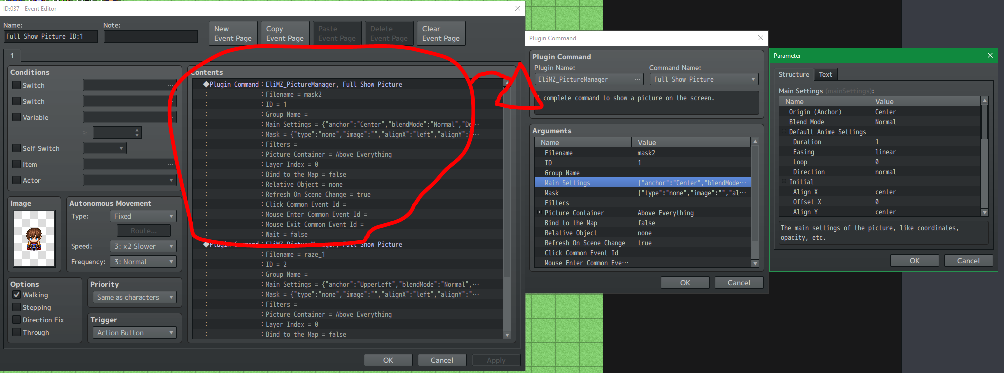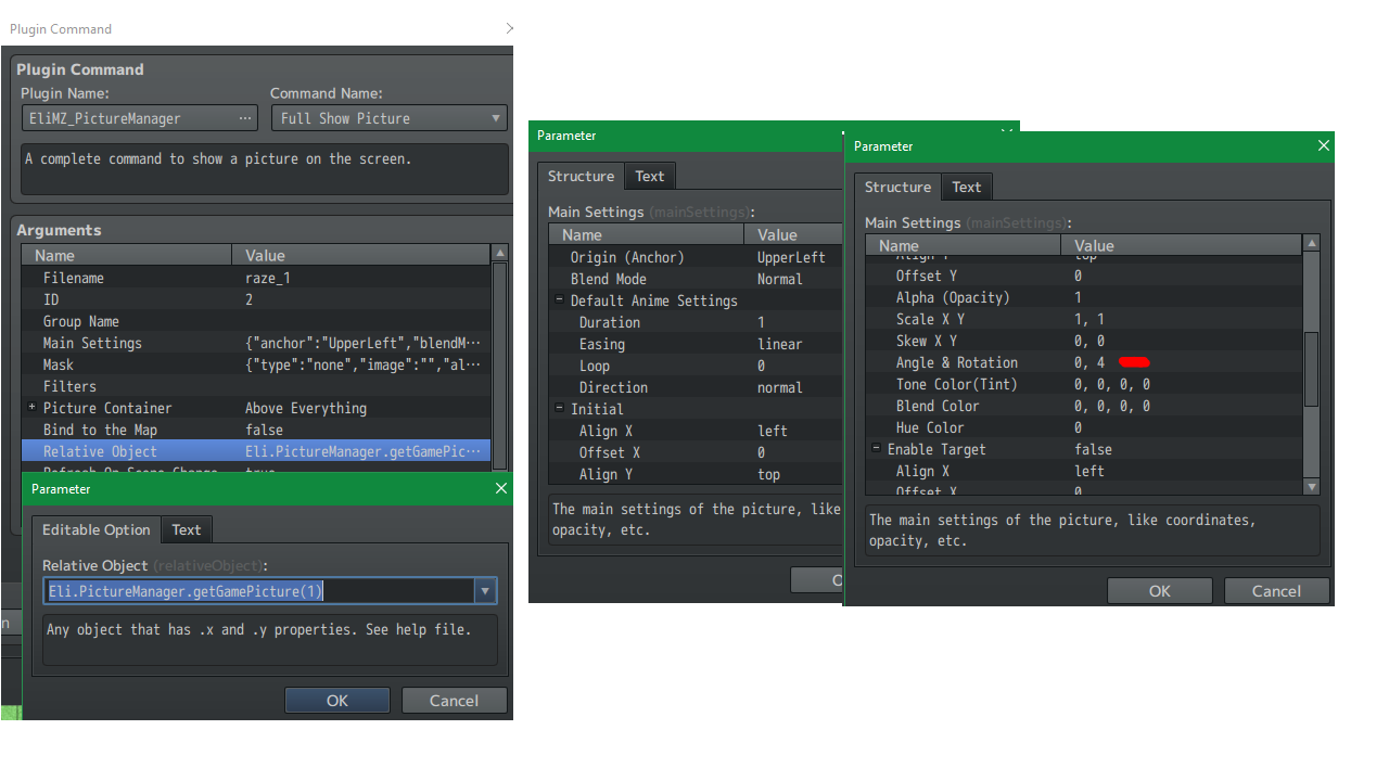 Hakuen is rotating around the red circle. Basically, the first picture must have it's anchor to Center. Then, the second picture, must have it's Relative Object as the first picture (Eli.PictureManager.getGamePicture(ID)). Anchor set at Upper Left and rotation set to any number you want, above 0.