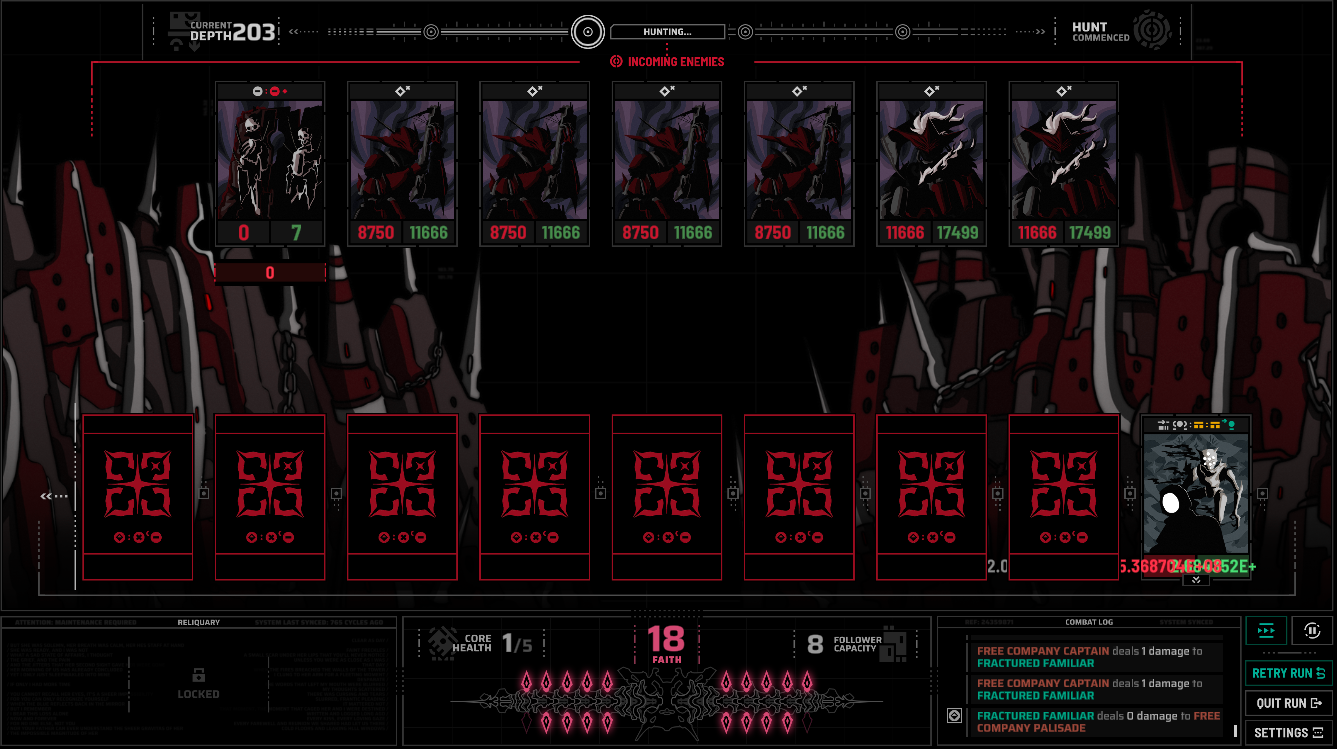 I had an adaptive duelist+familiar build, having given said familiar the dragoon ability and the adaptive aspect+ the ability of the paladin(?), lots of beekeepers and hellhounds at the front, all the important pieces held down with nails, the type of build that makes you confident it could go on into infinity even when you know it's not mathematically possible. And then I go into a hunt against the free company and while all the small units dealt 1 damage to the palisade no problem, the familiar wasn't able to?
