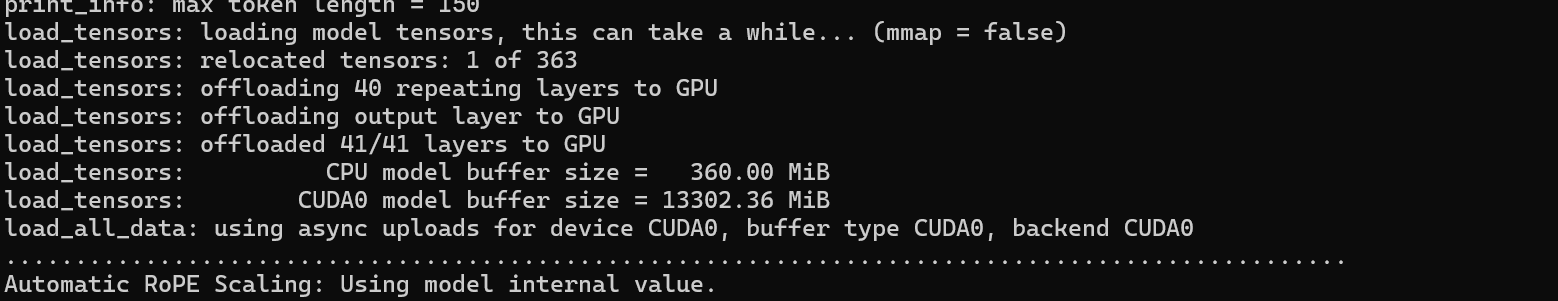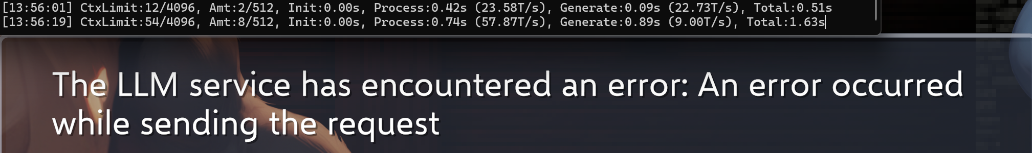 As for the slowness, the game is correctly offloading all layers to the GPU. I can't fully gauge the performance from the two successful API calls you posted since they have very few input/output tokens, but I've uploaded a new version that makes 5000 series RTX GPUs use a special backend setting, which when not selected, resulted in much slower (though not minutes long) processing during my testing.