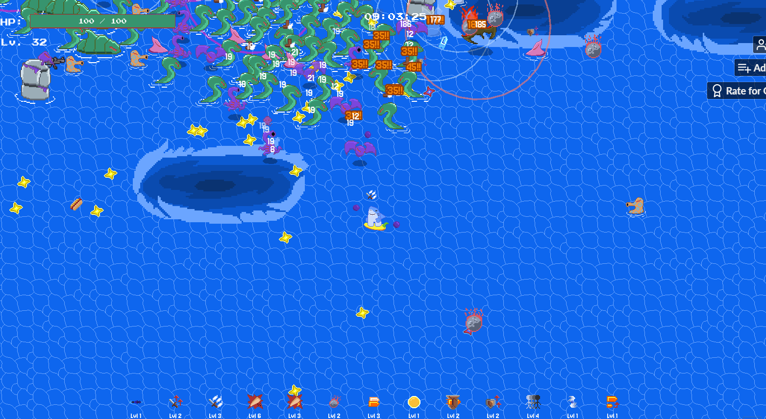 Nice vampire survivors game! I got to around 10 min but the fps was dropping like crazy by this point hahah. Whirlpools were an interesting mechanic and I think the upgrades / enemy variety were done well
