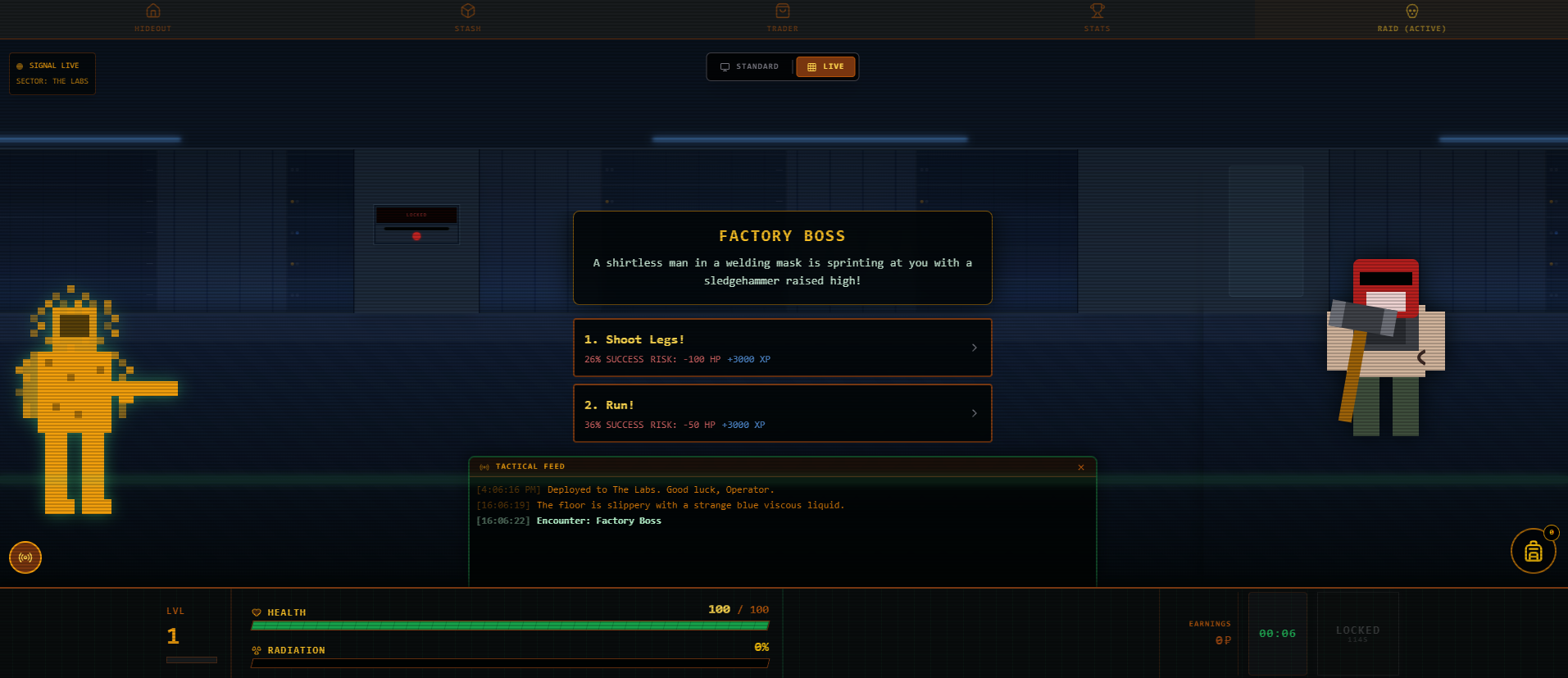Zone Idle is a Text-Based Singleplayer Extraction Simulator game inspired by the Tarkov and Stalker worlds and games. A low-stakes rendition of the extraction experience right in your pocket or on your other screen while you relax. Build up your stash and your hideout as you brave The Zone's harsh environments from The Cordon to The Labs. Find keycards to loot points of interests, artifacts to strengthen your PMC, and better gear to increase your odds of surviving encounters. If your luck takes a turn for the worse, you can always deploy a scav run and hope for the best.