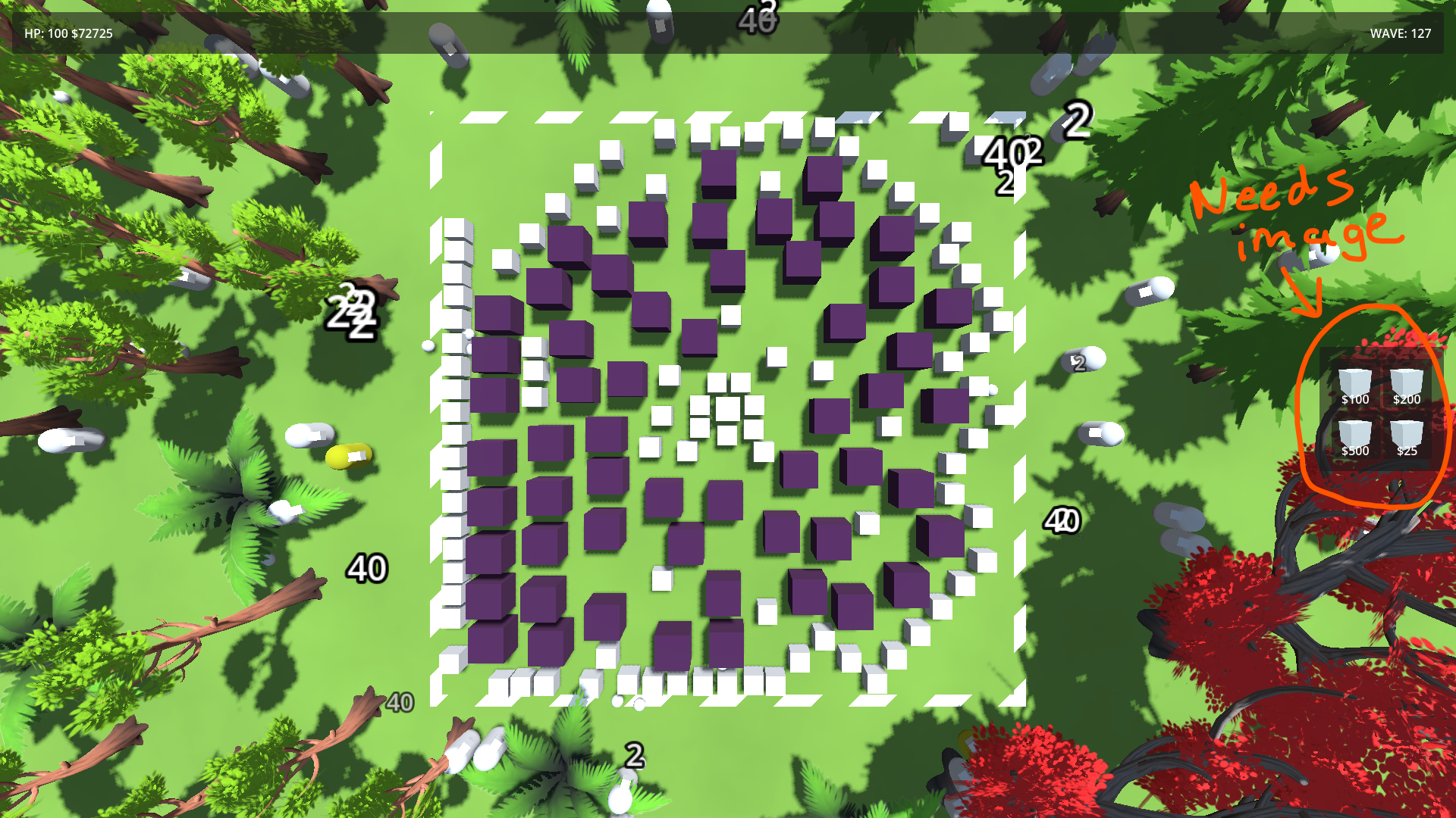 Cool game! Not sure how the enemies are supposed to even breach the defenses after I threw a wall around the entire area like this lol: