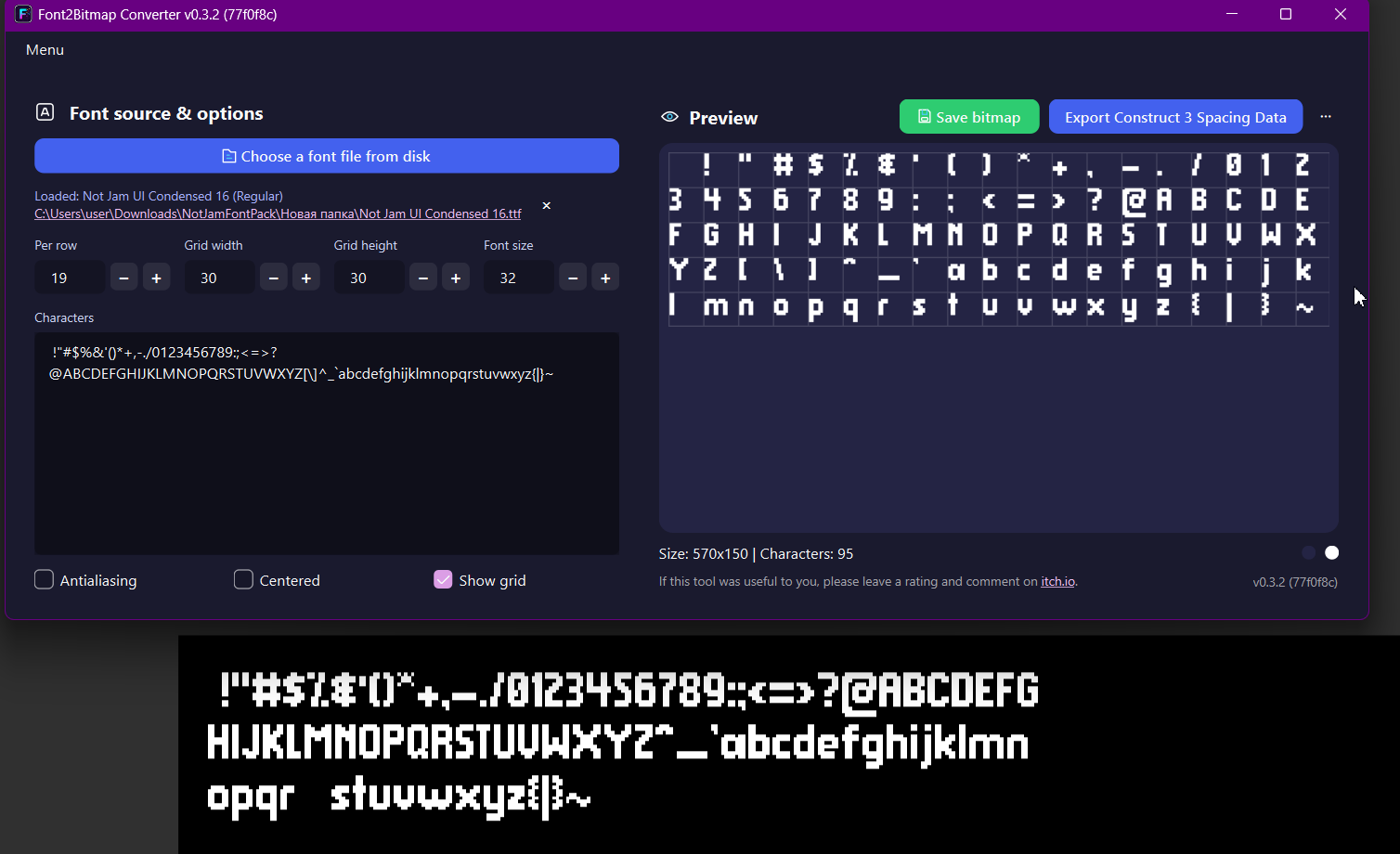 For some reason, specifically lowercase 'r' spacing is off for me in Construct 3 (there is a lot of space after it). Font works correctly if used as ttf with default text object. Am im doing something wrong? Didnt do anything special, just disabled AA, exported the image and copied the settings