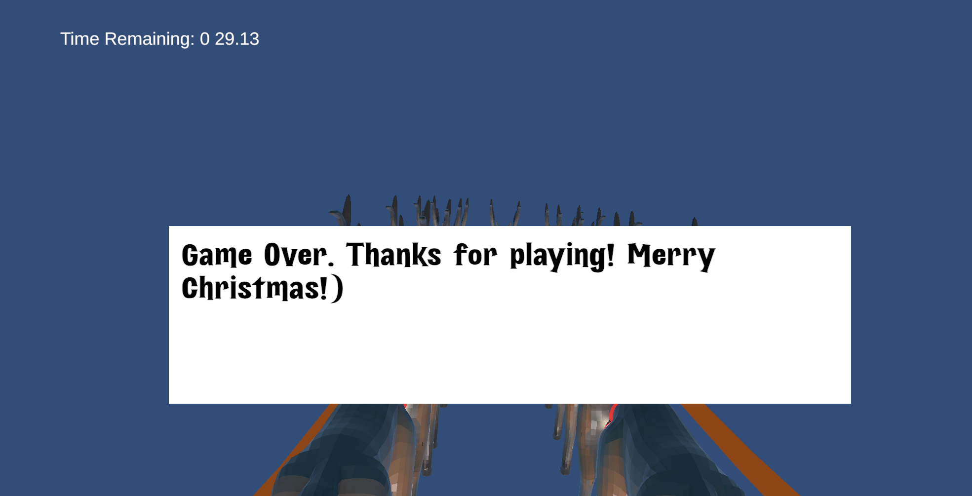 Thank yoU! I did have to add some form of pressure into the game, so that mechanic came around time. Had there been a bit more world design time, I would have done a 'bonus round' of shooting presents into houses OR 'opposing forces' messing with your run.
