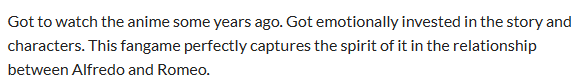 I then released for O2A2 The Blue Skies of Milan, my first fangame (well, I guess second if you count the Shrek one), and well, I gushed enough about this anime in the dedicated devlog, but I insist that you watch Romeo’s Blue Skies, because that’s just the best anime ever, period. So, the goal of this game was to explore the character of Alfredo and, in particular, to explore his dread regarding… spoilers, but I had a lot of fun writing it, coding it, drawing the illustration for this game, and study, from an artistic standpoint, the way the anime approached skies, which are so important for its story. And I mean, I received this review, and that’s all I needed: