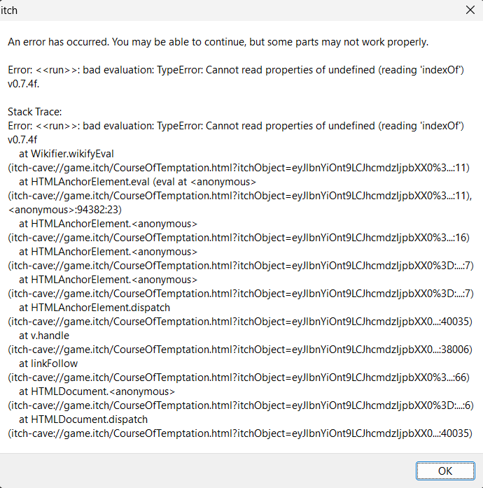 EDIT: It stopped me from completing the best friend favor scene (when you get to the point of selecting between how you feel about sleeping in the same bed) and brought up this error. I'm playing via Windows 11 on the itch.io app. I could not select "You feel some things about this" after this pop-up, but I could click on other things.