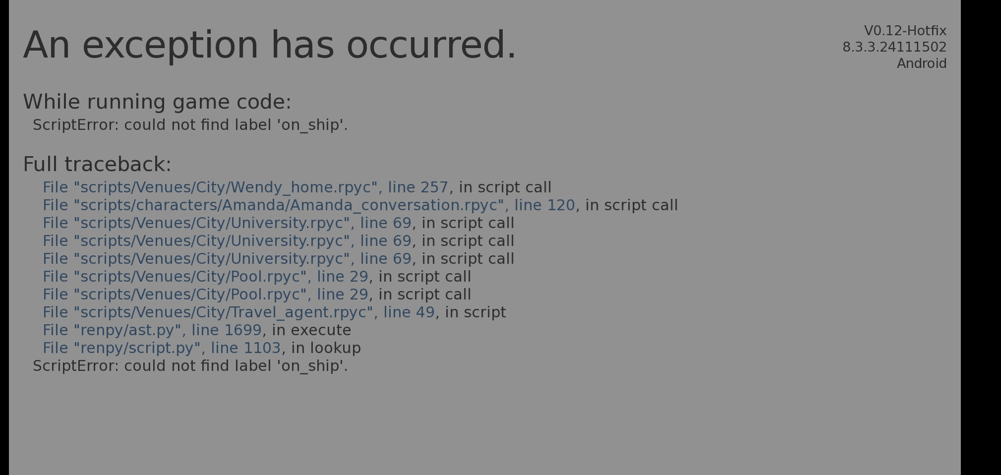 Based on anirishnirvana and Flobrtr, you and delete the Ferry.rpyc file in game/scripts/Venues/Island to fix the issue (for Windows and Mac)
