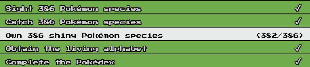 bonjour khydra encore merci pour ce jeux, j'ai trouvé quelque bug au niveau des shinny j'ai tout les pokémon et tous en shinny mais 4 ne sont pas comptabilisé je vous joint la capture d'écran