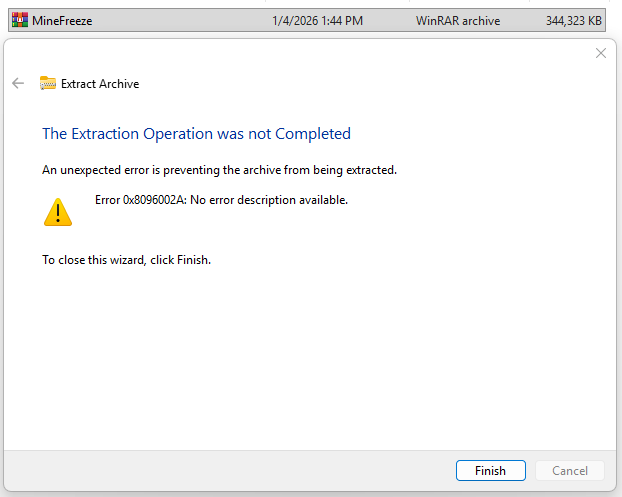 For anyone else getting this error when extracting, double click the MineFreeze.rar file > Windows > Frozen.exe and you can play the game: