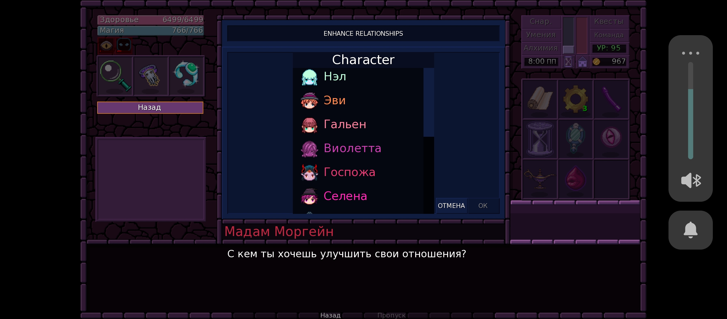 My relationship with Nel is at its maximum (10.9), with Violetta (9.9) With Evi too, at maximum, and with everyone you can, well, except maybe with Faylen, Selena and Vivi.