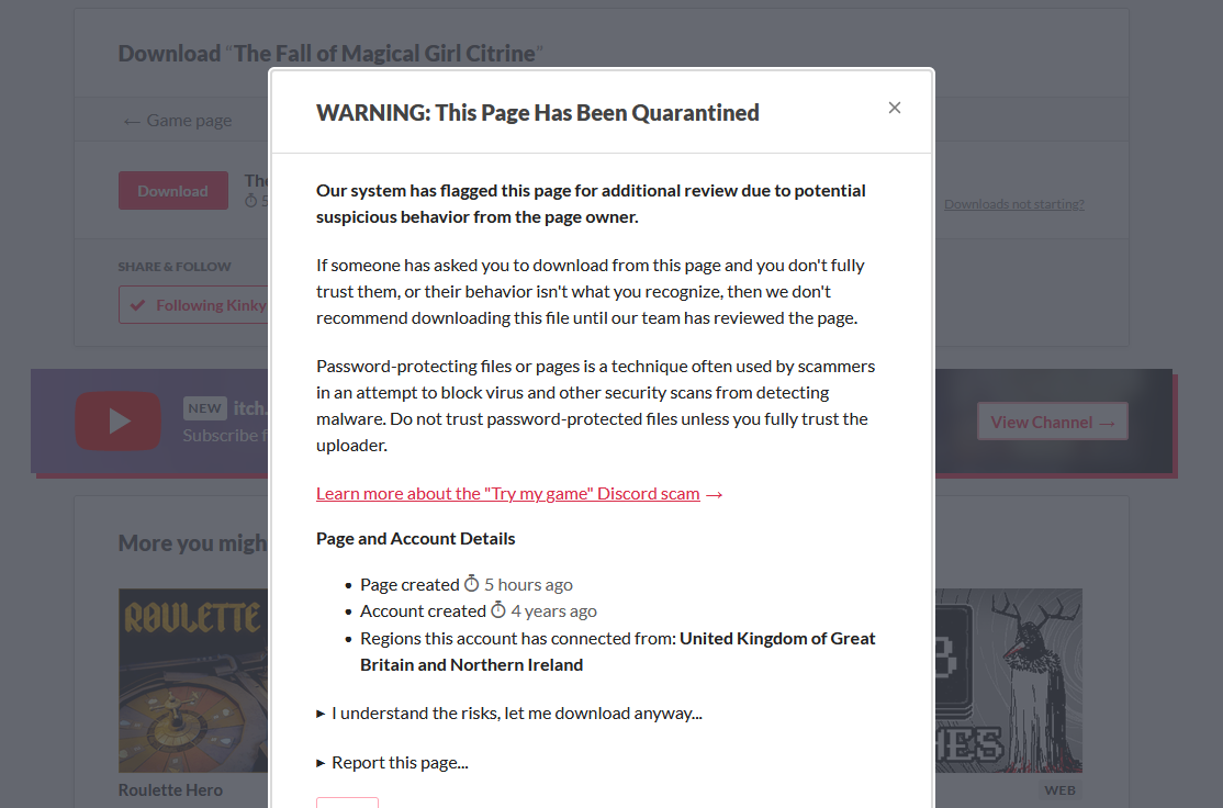 Can confirm that KinkyPear is getting this page everytime they update a game or release a new one. Should be safe, but you can wait a bit for it to be fix.