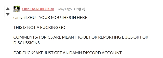 dude this wasnt meant for a group chatsdiscord is for group chatsand also comments and/or topics was meant for fucking discussionsnow everyone turned it into a gc