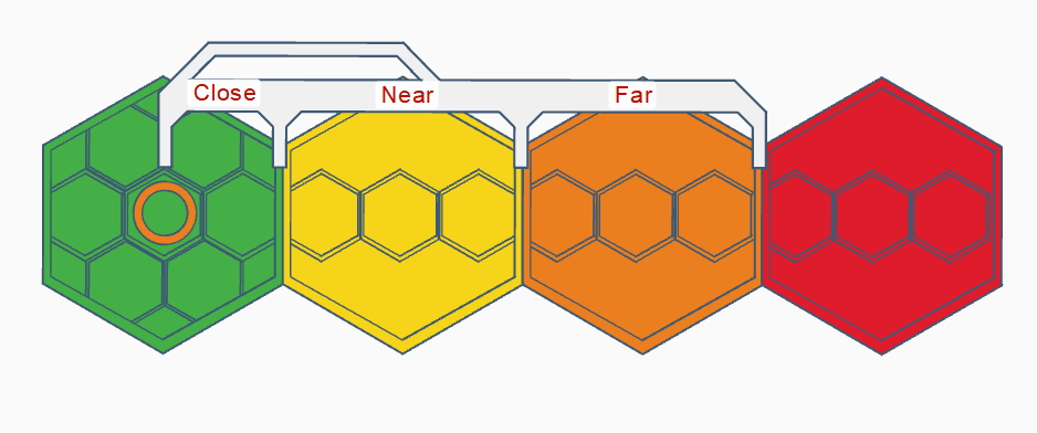 The one main takeaway from the first campaign - since we don't have hex field with big hexes, had to homerule scales and distances. Basically, I've divided "bix hexes" to smaller ones, turning those into "areas". This way this ruler was born, gotta place it's end on mini's head and then check in which area possible target fits. Having several of these during play helps with the combat a lot, allowing players to measure distances and test LOS of their Frames right on spot.