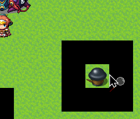 As you can see from the image, the mouse pointer is just one pixel beyond the tile where the event is located (the image of which is taken from the map's tilesetB) and calls up the cursor image, and when I click the mouse, it triggers the event. (Even without the extra cursor image, the event still triggers, but I admit that without the cursor image, I never would have found this bug.)