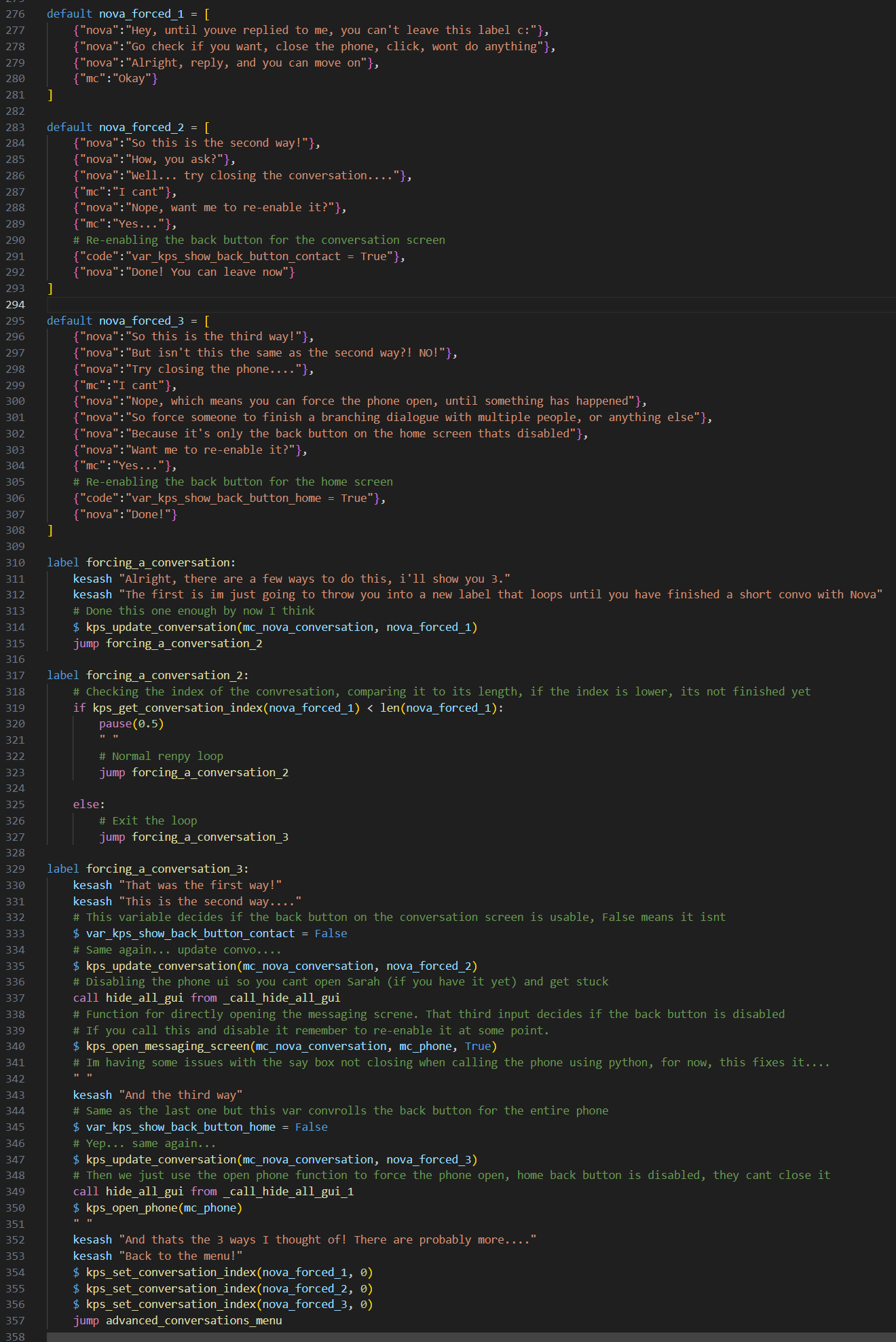 i'm trying to switch between regular renpy labeling & dialogue and the phone. i'm making it where you need to check the phone conversations in order to continue with the renpy portion.