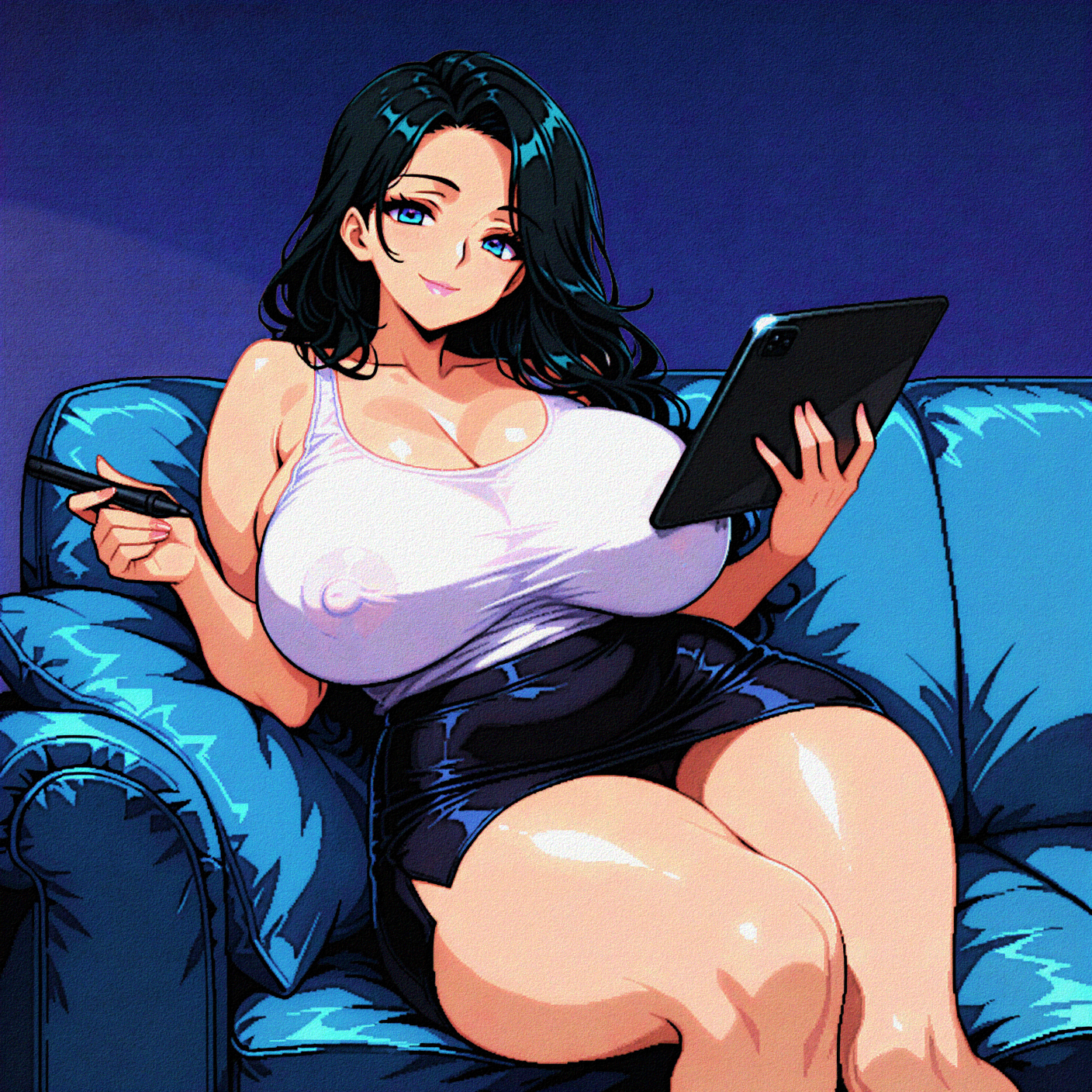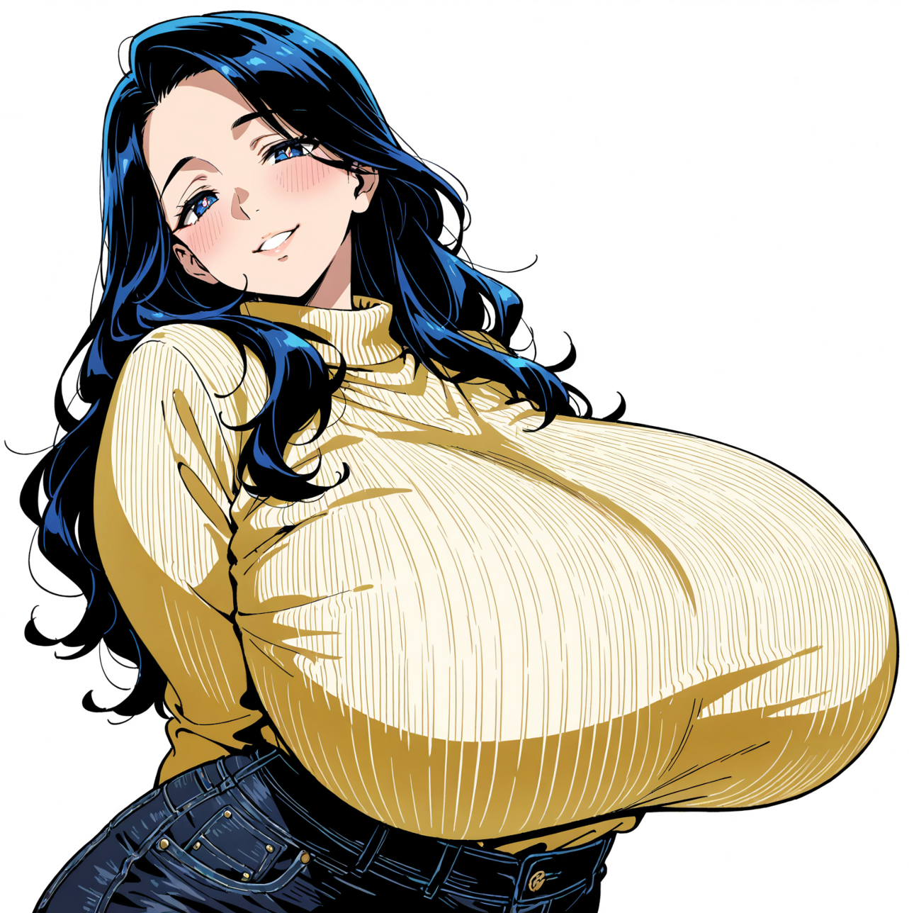 masterpiece, best quality, high quality, ultra detailed illustration, 1woman, 40 years old, solo, beautiful mature woman, voluptuous curvy figure, hourglass body, gigantic breasts, massive plump bust, huge breasts, very large breasts, tight golden yellow high-neck sweater hugging breasts,tight blue jeans, distressed denim, long wavy dark black hair, flowing hair, bright blue eyes, detailed pupils, fair skin, blushing cheeks, gentle seductive smile, slightly parted lips, confident expression, arms crossed behind back, pushing up bust, standing pose, full body, thick thighs, wide hips, tight black leggings, form-fitting black pants, detailed clothing texture, soft shading, anime style with semi-realistic details, vibrant colors, soft lighting, close up image of her upper body, solid white background