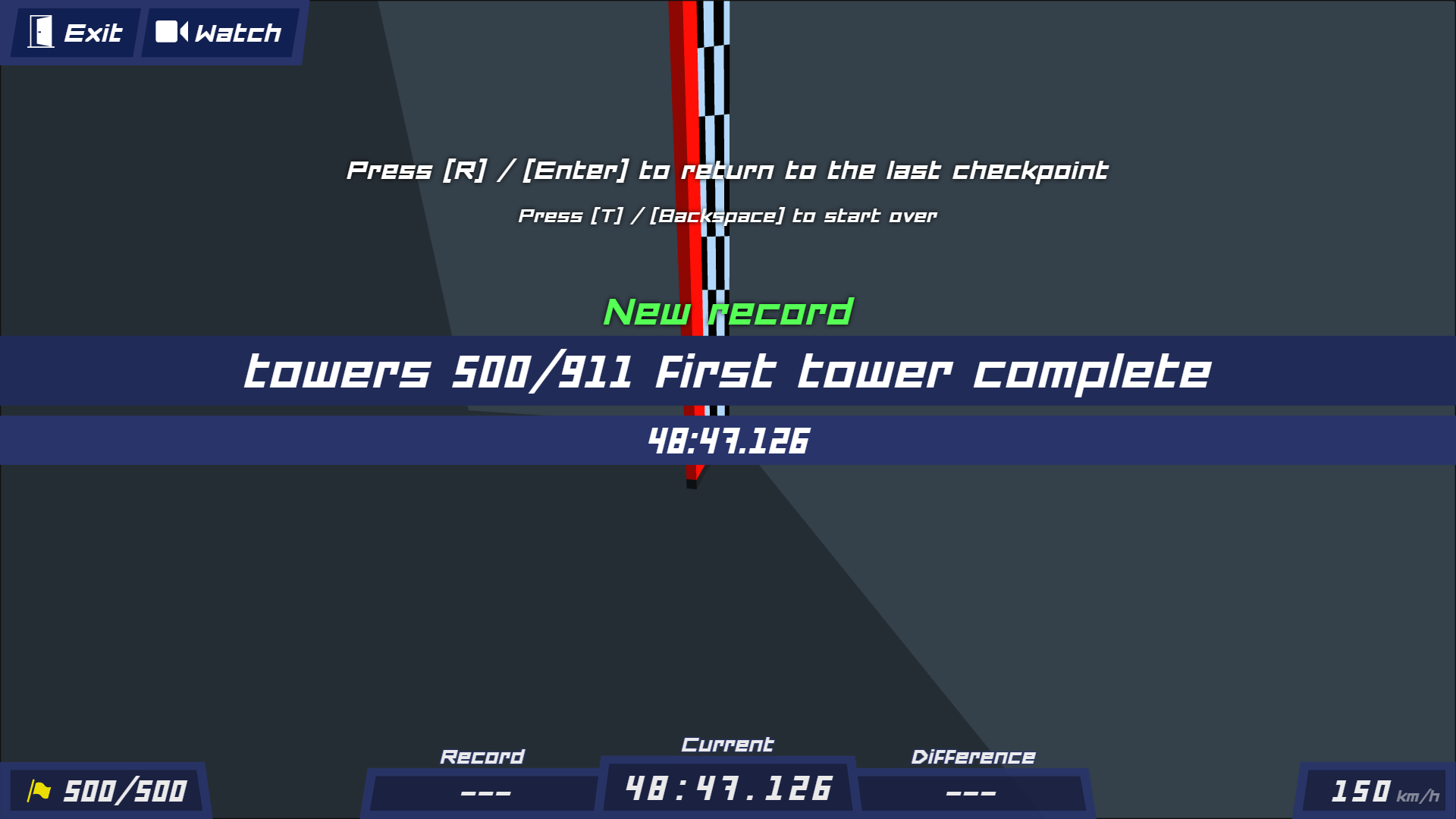 Great job finishing! checkpoints 400-500 are fullspeed, and allowing you to restart from those would mess up the speed checks. As for the length, the final version will be 911 checkpoints with the track being in the shape of the twin towers. I know its a grind, but thats kinda the point. Do let me know if you think I should change anything though. Thanks