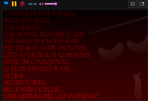 the raging fire howls - keep to sin and stare out the beast's eyes but the scene was too gruesome. Blood strewn across the floorboards, soaking into the carpet. The victim's back was split apart, hands and feet severed off at the joints. Every inch of skin had been ripped at and peeled away. The red silhouette of a thin human. She died without an ounce of mercy.