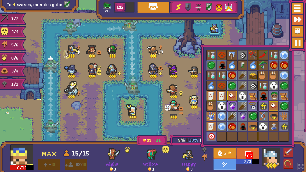 And this was my loadout when I started. The only major difference in the characters seen on the other picture is that I had three star miners for the majority of the game, but nearing level 50 I was so close to failing that I switched them out for more damage and wound up selling them later. So I was all in on economy in the beginning and did fairly well thanks to it, but I feel like in the end it was just that all the stars aligned, ie. it was down to luck more so than any single thing being so broken that they hard carried me. Or that's what it felt like, I'm sure you can deduce more than I just based on these pics alone.