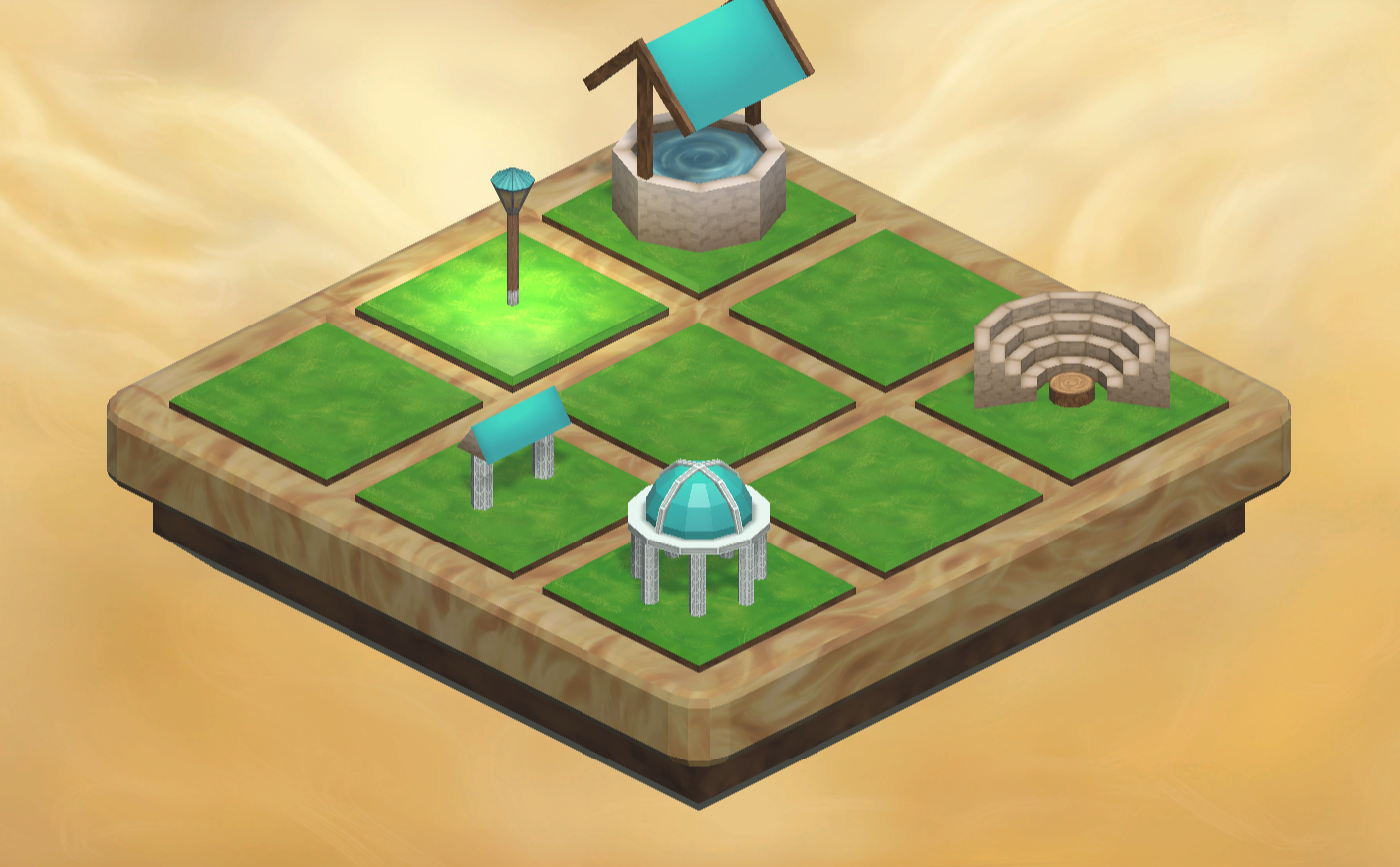 I did, though, get a grid that I can't figure out how to solve. (Are they hand-generated or auto-generated?) There's a well in a corner; a stage that doesn't want to be next to anything; a lamp that doesn't want a tile next to it and doesn't want to be in a corner; a gate that wants a tile around it; a pavilion that doesn't want a tile in its corners; and four grass.