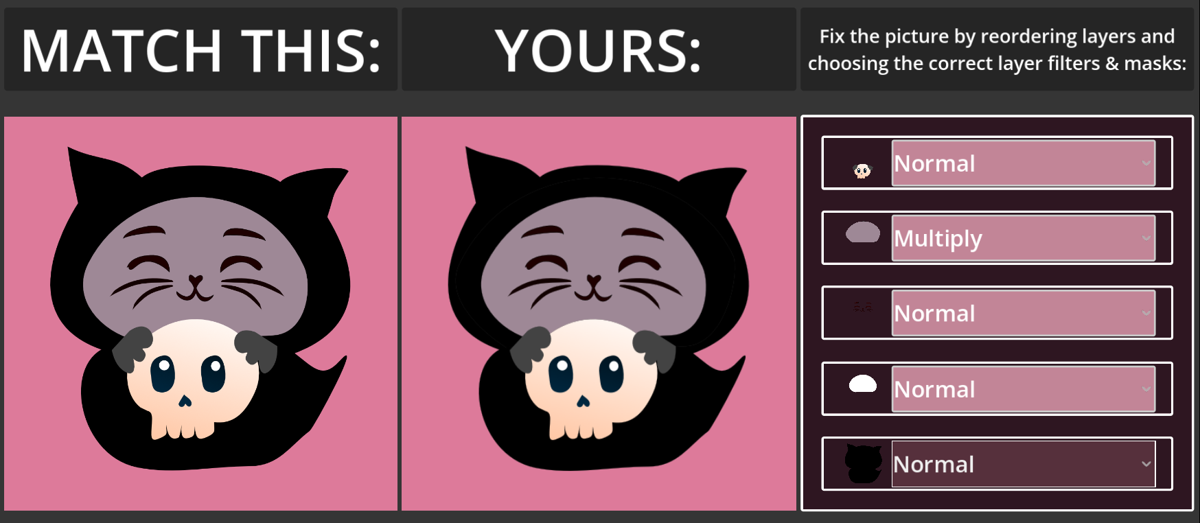 The face layer needs to be set to normal and beneith the grey multiply layer