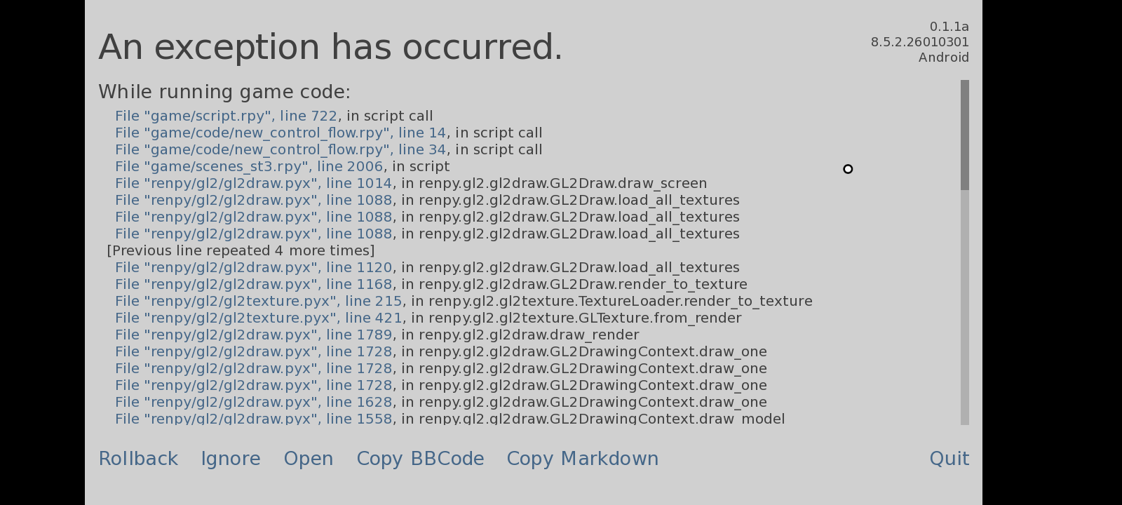 Hey there! Loving the game so far! Unfortunately, in the library when talking to Noah and Emma via the "Drunk" option, specifically right after Noah says the line about "MY man", this screen pops up after it switches to what I assume is a flashback, given the sudden change in music. Can't get past it either.