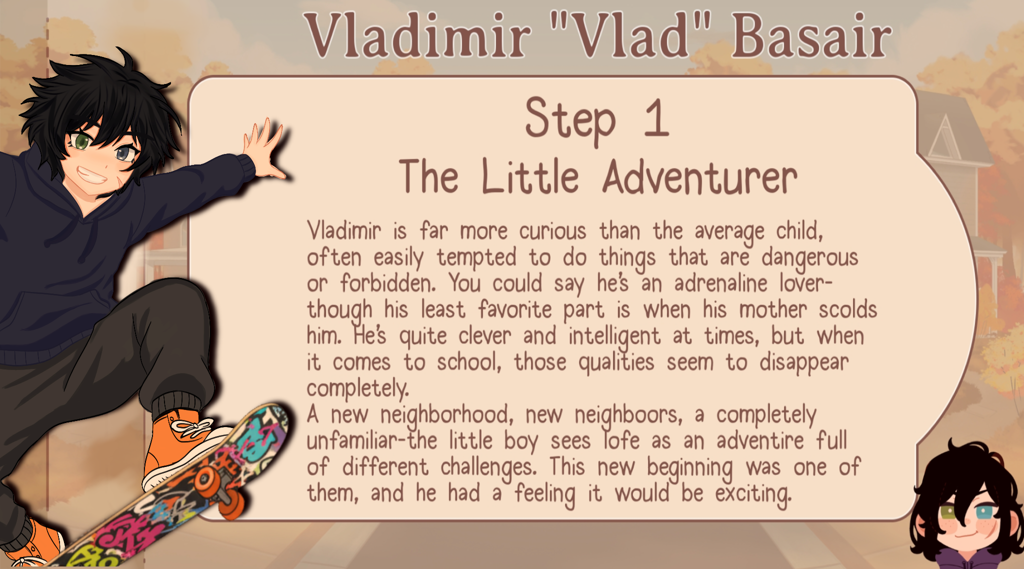 First of all, I want to say this demo is so wonderful that I've already read it twice and I'm not bored at all. You're doing a really great job; the dedication and love you put into it is very evident. I'll wait as long as it takes to read it completely because I truly love this visual novel. Now, I've seen that some users are sharing artwork of their MCs, and they're all so cute that I'm a little embarrassed to share mine. Besides, my art isn't that great, but it's done and I really wanted to share it. I hope my little Vladimir is well-received here. (Please excuse any mistakes; I'm still learning the languag😭)