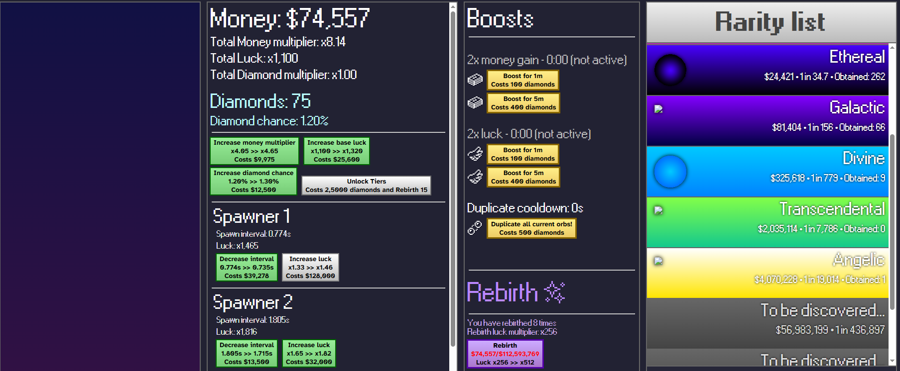 1: the very first rebirth, i was left with 34 diamonds. seems like a rounding error