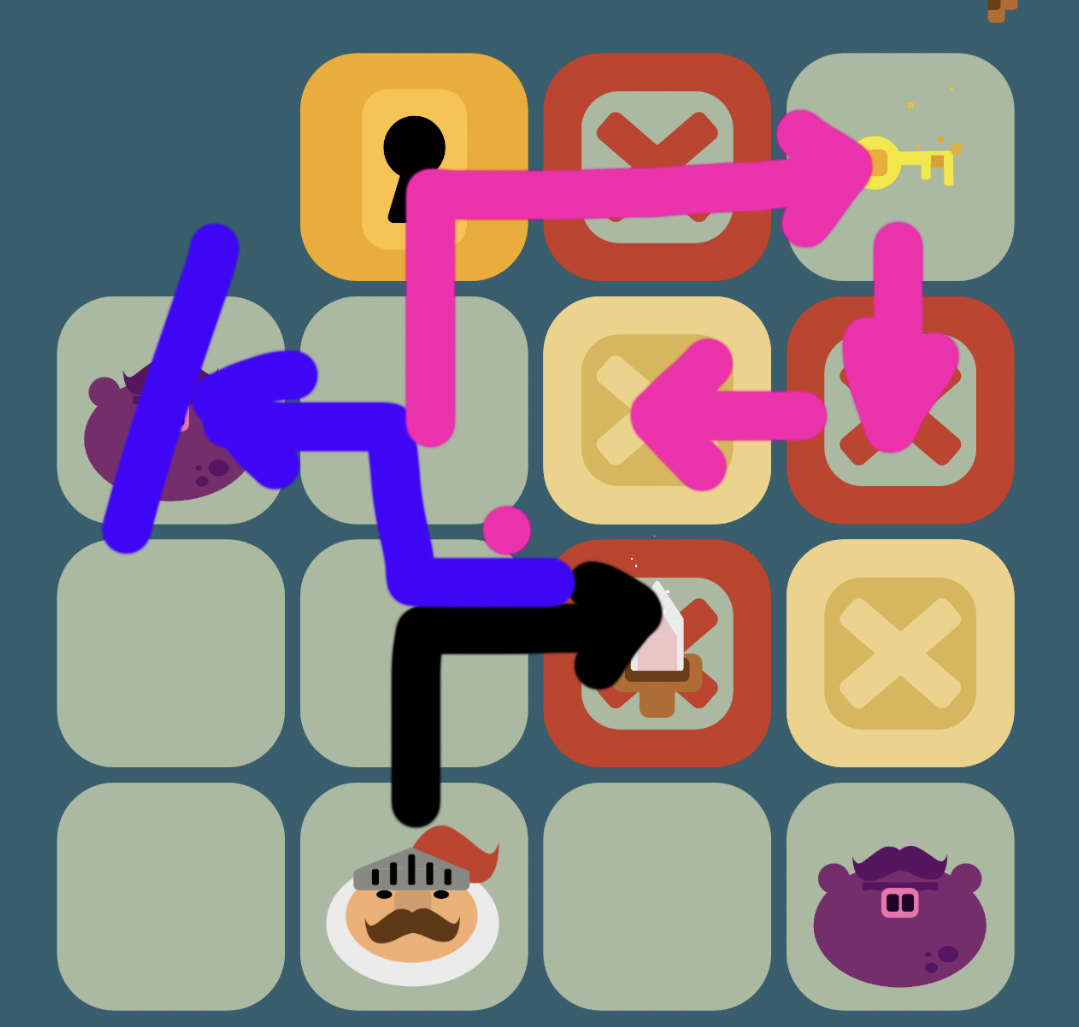 Hey, thanks a bunch for playing my game! I’ve put together this chart to help you breeze through the 6th level. You’ll notice I used different amounts of swords and pigs, so you’ll need to think carefully before using a sword. In that level, I’m trying to trick you with the pig in the bottom right corner. Oh, and the game has a cool ending cutscene! I think it might have flown under your radar because of the difficulty curve. Anyway, don’t forget to download those custom itch.io profile pics I made! :)
