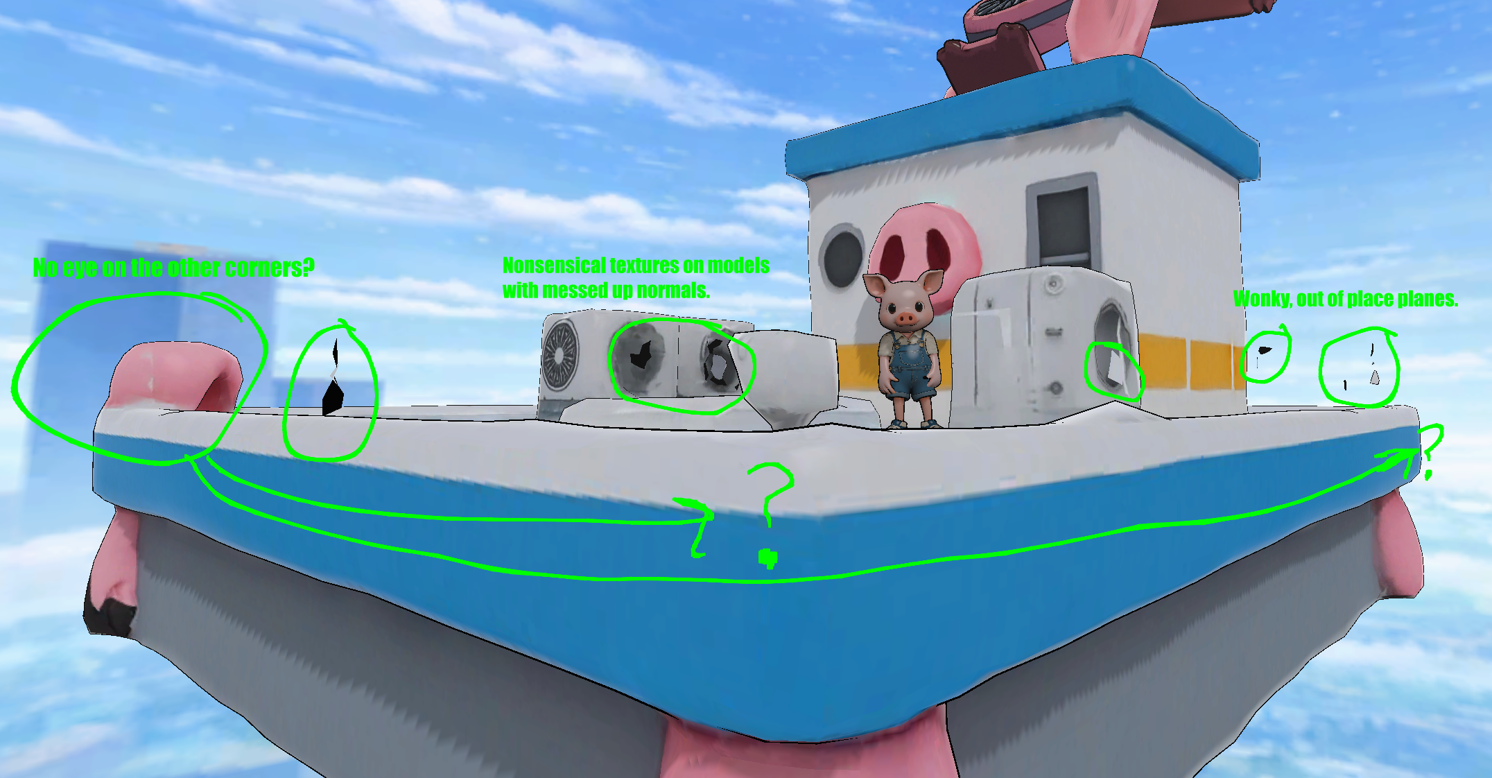 Ex D) The models are odd, specifically the base platform. There are several little planes, disconnected to the model that shouldn't be there. How did they get there? Why would a human build it like that? The air conditioners(?) have meshes that look like the normals are reversed where it is black, or the texture is clipping into another part of the mesh. The textures don't really make any sense if you look at them long enough, suggesting that they are probably AI generated. Why does only one of the four corners of this platform have a pig foot with an eye on it? Seems like a messed up pattern because there is no clear intent why it would be like that. Best case scenario is a bad photogrammetry scan/generation. But if that's the case, how was it generated?