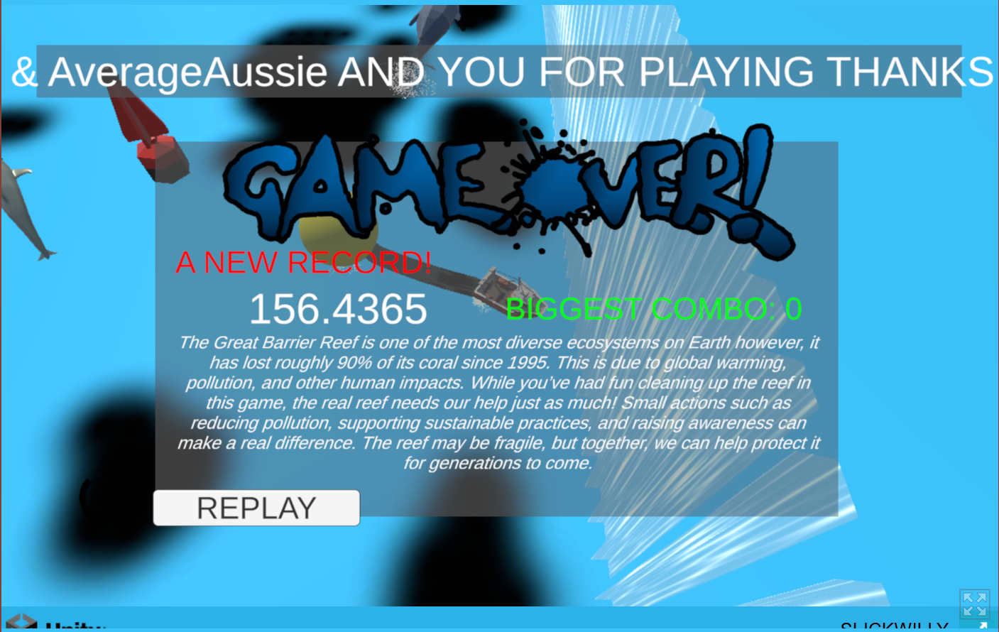 nice thanks for playing :DI didnt have time to organically play the game myself (i had an instant "clean ocean" debug button for checking end game stuff) so I didnt get to set any sorry! in a future update maybe :D