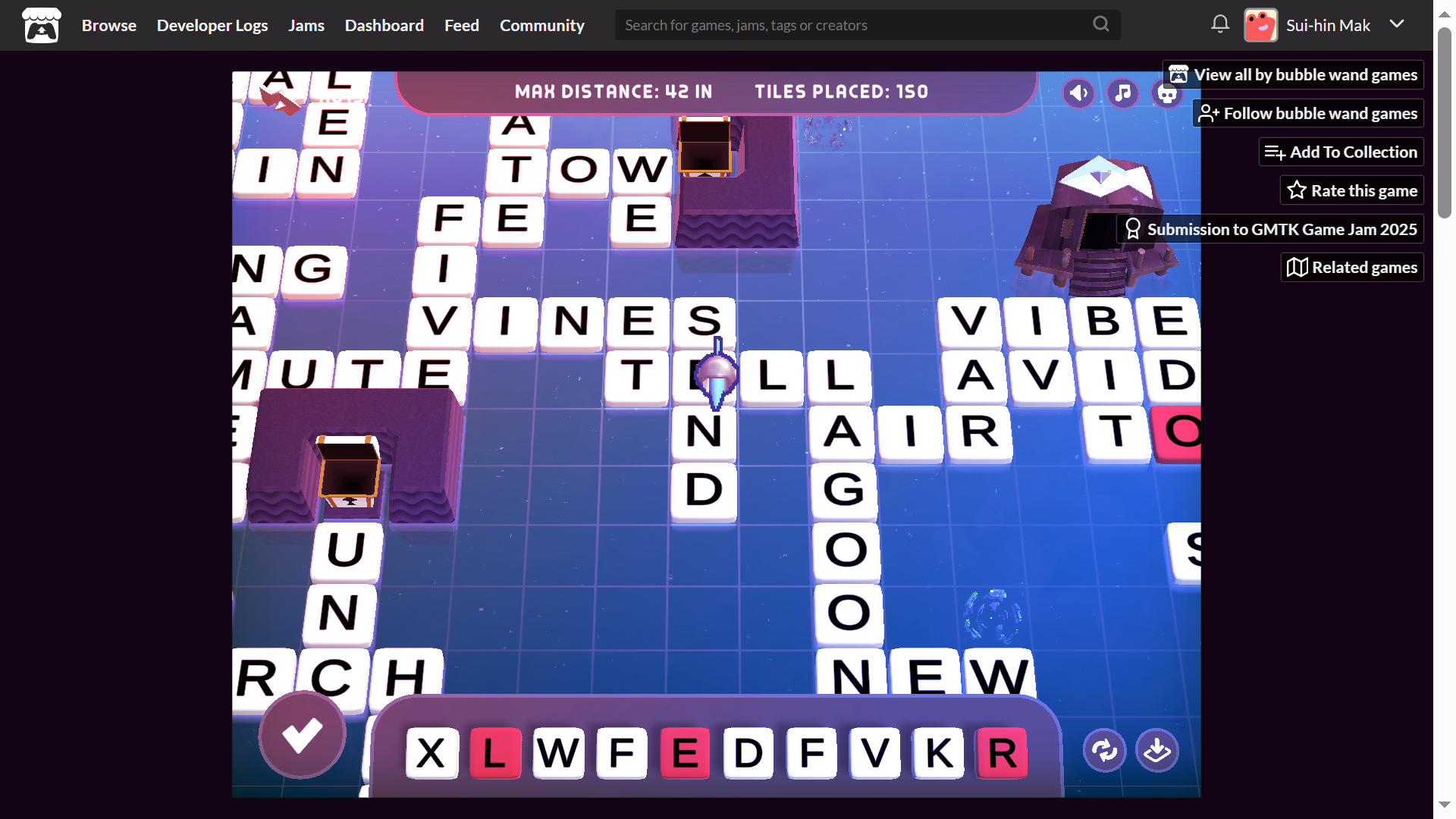 I think it has promise! There are the bugs (the crashing; the surrounded chest that still says "7/8"), possibly some QoL issues (I kept trying to fish when I was just a little too far onto an adjacent tile; sometimes the letter draws felt imbalanced), and of course it would be nice if the game had more to it (an exit to a next level? a store for spending fish?). But it's a really solid core of a game.