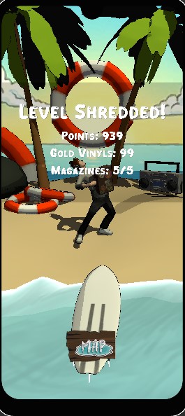 Aight cool! here’s an ending level screenshot. We’re supposed to show the player: 'Stoke Points' 'Gold Vinyls' and 'Magazines' collected. It’s a surf, level beating mobile game with a punk, hardcore, and ska soundtrack. Fast paced, with skate style tricks on a surfboard. Think Tony Hawk’s Pro but in the water