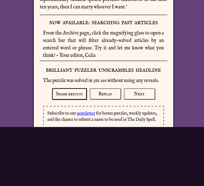Not sure if this is a me problem or a webpage source problem. On the-daily-spell.com on desktop (firefox) the darker purple area that raises and lowers overlaps on a lot of completed puzzles, sometimes only a little, sometimes a lot like in the example.