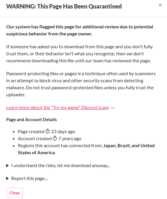 I’ve already emailed itch.io to look into this. Part of my team is from Japan and the US, so it was really unfortunate that itch associated our demo release with a scam =(