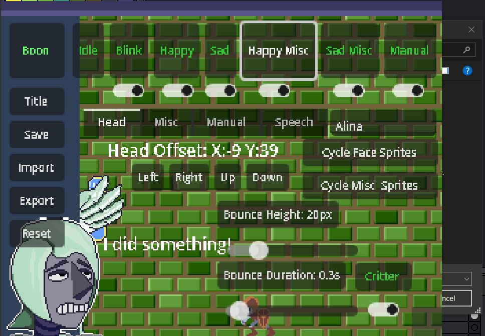 So like having some reference/base to go off of when designing the sprites would be much appreciated. I kind of just had to guess the scale of the sprites, and well she ended up being massive compared to the other characters, and I just gave up on even trying to do the manual sprites. Idk if you want to like just have the sprites for the base characters accessible, but it can just a rough faceless character to use as a scale guide would be very useful.
