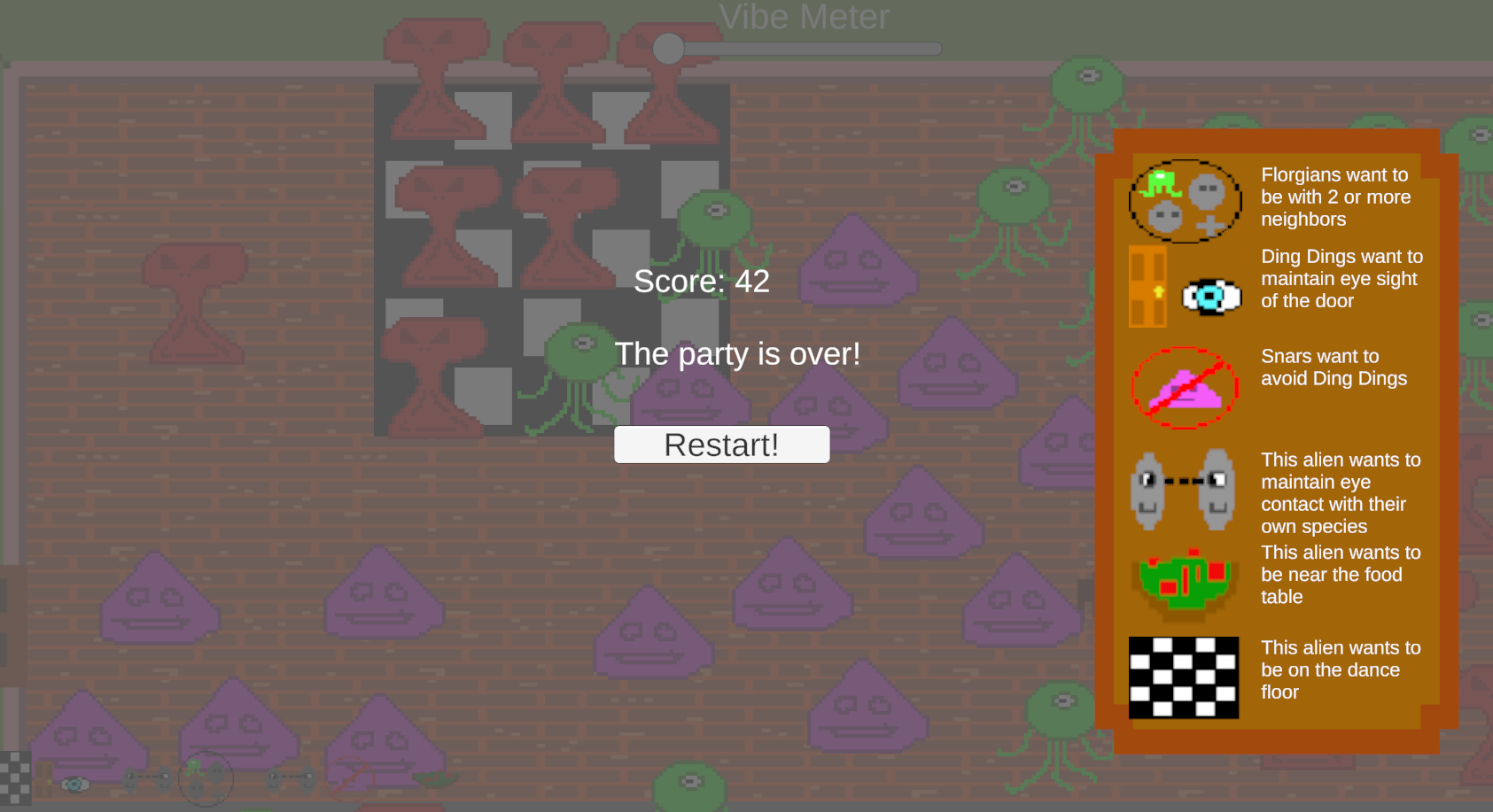 Really cool idea for a game. I liked the concept of aliens showing up with specific conditions and having to manage the house party around that. The drag-and-drop system worked well, and juggling the vibe meter with limited space made it more stressful in a good way.