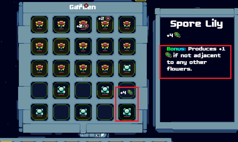 Still, I'm not sure if bonuses work, or at least they're not clear to me. At first I thought I didn't understand, but basically no bonus seem to work. For instance the attached image for lilies (still it happens with the rest of the flowers too). For instance I'm expecting for the bottom Lilies to produce +5 since they don't have any adjacent flowers (which is a bit limited already since the board is too small and I don't see the point really, I'd rather have the whole 2 rows of lilies instead of leaving empty slots just for a +1 bonus) but still all lilies produce 4 sap no matter if they have adjacent flowers or not. The same happens for other flowers, I try to trigger the bonuses but they don't seem to work. If you could clarify this i'd appreciate it. Thanks!!