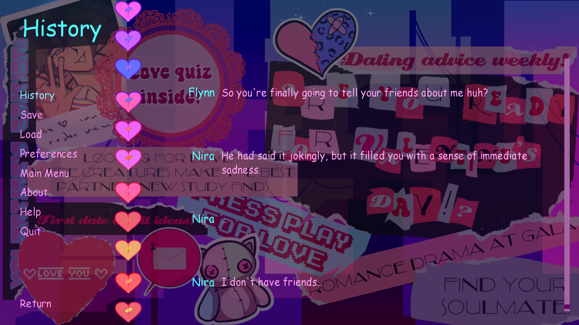 another one gem to rock with the aesthetic and design! i think i’ve said this before, i forgot, but the art that were put down into bits, lovely elements that livened up the setting! loving the cute cat plushies wallpaper, the weekly cat image, the cat toes mouse pointer, the cat browser icon, and most of all, THE catboy love interest you gotta set out for a toxic juicy love drama and possibly angsty trip down your ex’s history.
