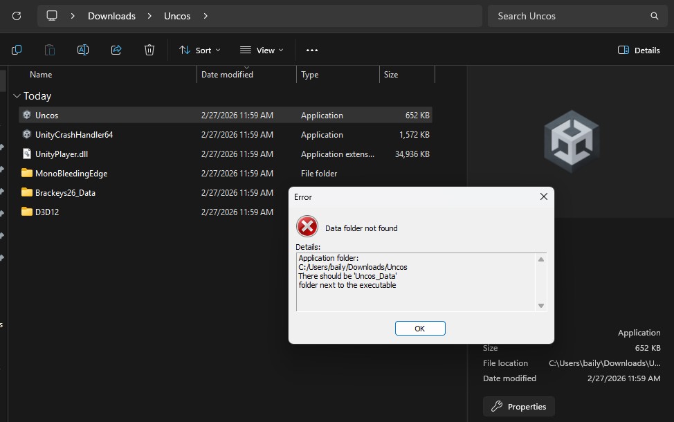 Apologies! I changed the executable name without changing the Data folder name. In theory, if you rename "Brackeys26_Data" to "Uncos_Data" it should work. If not, there's a fixed download link available as a Google Drive link on the itch page.