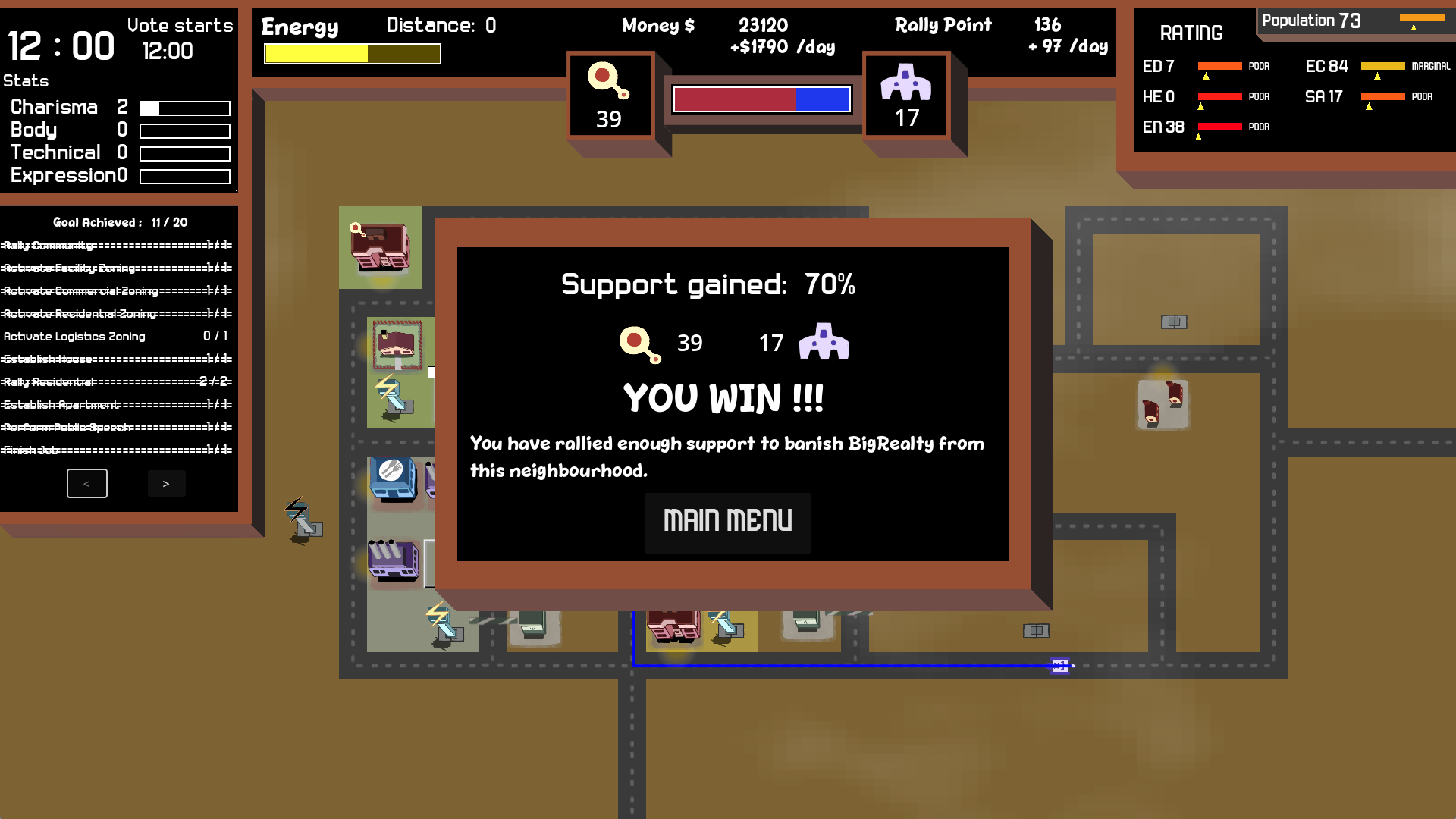 I played through to the end twice, winning both times. Here is a screenshot of my first playthrough game over screen. The second time was more about exploring things and I was more even on score when the last day started, but I had ~250 Rally Points, so at 08:00 I went to a block of houses that favored the opponent and rallied as many as I could to quickly gain the points to win.