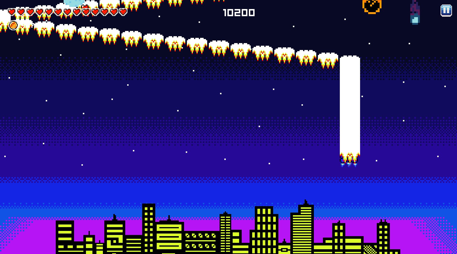 Le jeu est graphiquement très maitriser et la musique est bien même si j'aurais peut-être aimé un truc plus épique. Bon comme tu la déjà dit sa manque d'un boss et de bruitage (peut-être aussi élever la limite d'amélioration pour la cadence de tirs, la force des balles etc... si tu rajoute des météorites). Mais je trouve que se qui manque le plus c'est vraiment des VFX, tremblement de camera, effet visuel, particules ça rajoute facilement de l'intensité au gameplay et du fun mais je comprendrais que tu veuille le laisser tels quel pour rester dans l'esprit d'un jeu chill ce qui est le cas maintenant. Aussi je vais faire mon aigris mais il faudrait vraiment 2 bars de vie, une pour la ville et une pour le vaisseau, c'est pas logique qu'en améliorant le vaisseau la ville devient plus résistante et en plus les astéroïde passe à travers le vaisseau sans lui mettre de dégât et pour finir même si je vois le lien avec le thème, je n'ai pas trop l'impression de le retrouver dans le gameplay mais bon comme peu de gens on vraiment respecter le thème (je n'en fais pas partie) c'est pas important. Sinon super jeu. ah oui juste petit flex comme ça :